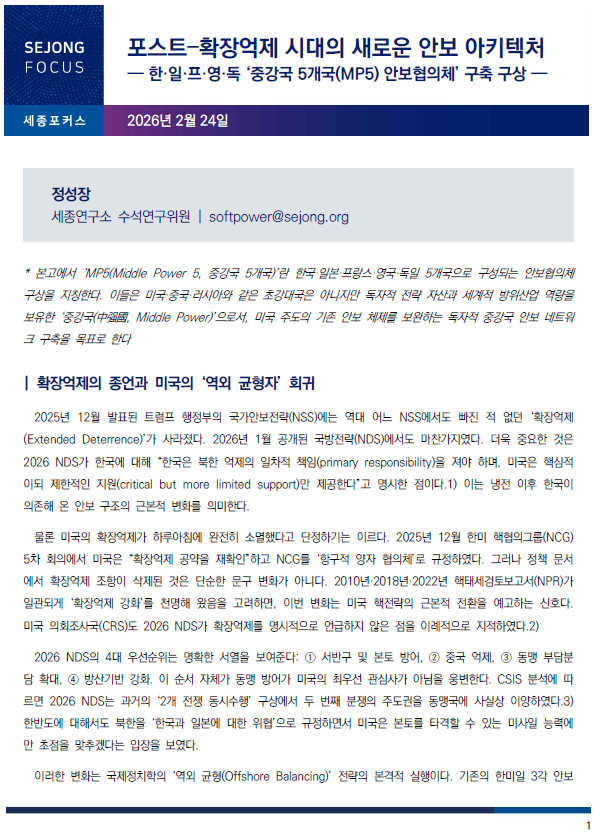 [세종포커스] 포스트–확장억제 시대의 새로운 안보 아키텍처 — 한·일·프·영·독 ‘중강국 5개국(MP5) 안보협의체’ 구축 구상 —