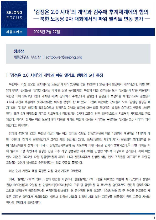 [세종포커스] ‘김정은 2.0 시대’의 개막과 김주애 후계체계에의 함의 — 북한 노동당 9차 대회에서의 파워 엘리트 변동 평가 —