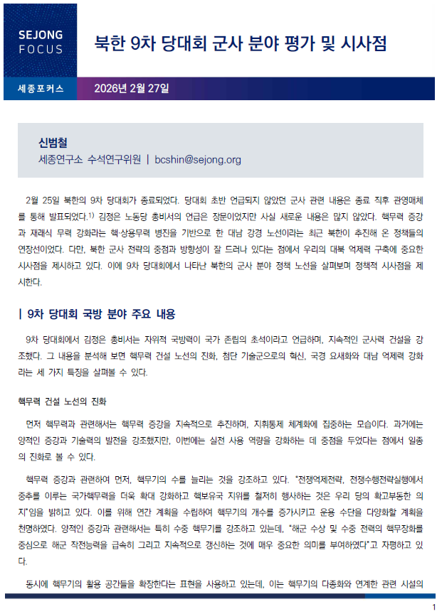 [세종포커스] 북한 9차 당대회 군사 분야 평가 및 시사점