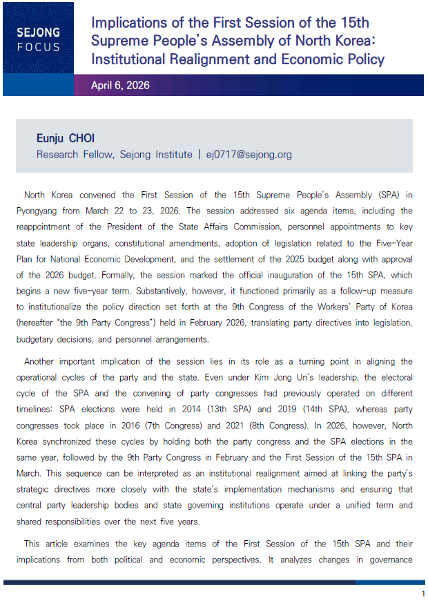[Sejong Focus] Implications of the First Session of the 15th Supreme People’s Assembly of North Korea: Institutional Realignment and Economic Policy