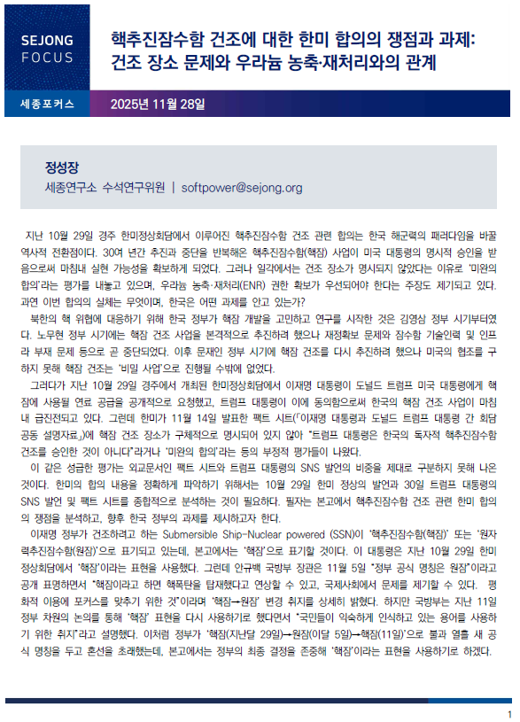 [세종포커스] 핵추진잠수함 건조에 대한 한미 합의의 쟁점과 과제:건조 장소 문제와 우라늄 농축․재처리와의 관계