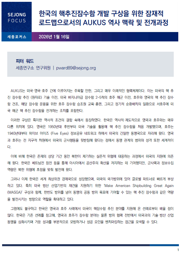 [세종포커스] 한국의 핵추진잠수함 개발 구상을 위한 잠재적 로드맵으로서의 AUKUS 역사 맥락 및 전개과정