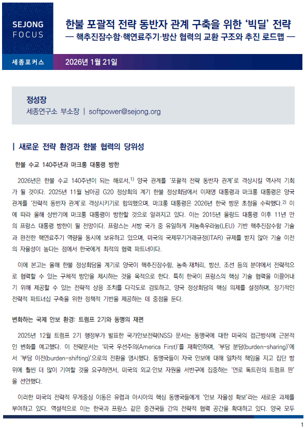 [세종포커스] 한불 포괄적 전략 동반자 관계 구축을 위한 ‘빅딜’ 전략 — 핵추진잠수함·핵연료주기·방산 협력의 교환 구조와 추진 로드맵 —