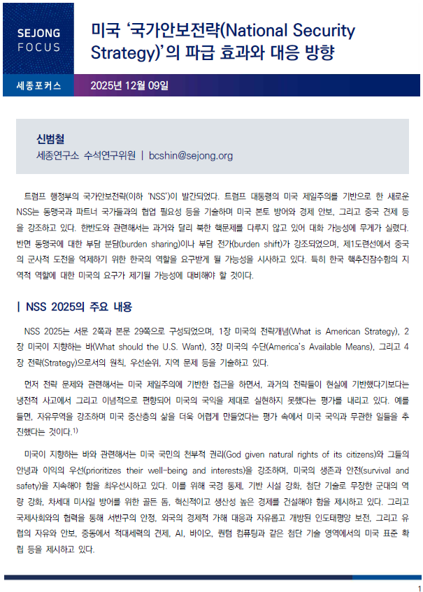 1) The White House, National Security Strategy of 2025, p.1. see https://www.whitehouse.gov/wp-content/uploads/2025/12/2025-National-Security-Strategy.pdf (2025. 12. 8. 방문)