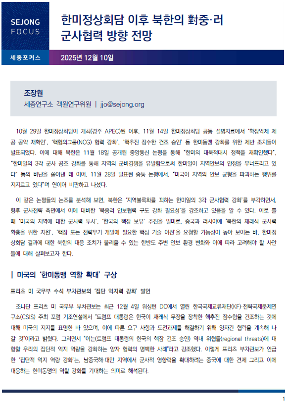 10월 29일 한미정상회담이 개최(경주 APEC)된 이후, 11월 14일 한미정상회담 공동 설명자료에서 ‘확장억제 제공 공약 재확인’, ‘핵협의그룹(NCG) 협력 강화’, ‘핵추진 잠수한 건조 승인’ 등 한미동맹 강화를 위한 제반 조치들이 발표되었다.