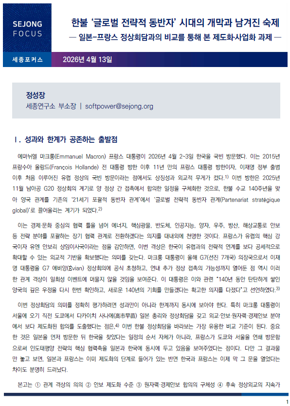 2) 정성장, “한불 수교 140주년과 중강국(中强國) 협력의 새로운 설계,” 『세종포커스』, 2026.3.26.