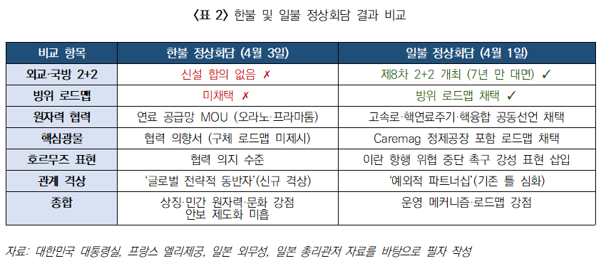 이번 한불 정상회담의 성과를 과대평가하지 않기 위해서는, 마크롱 대통령이 방한 직전 도쿄에서 개최한 일본-프랑스(日佛) 정상회담 결과와의 비교가 필수적이다. 4월 1일 일본과 프랑스는 제8차 외교·국방장관 2+2 회의(7년 만의 대면)를 별도로 개최하고,19)