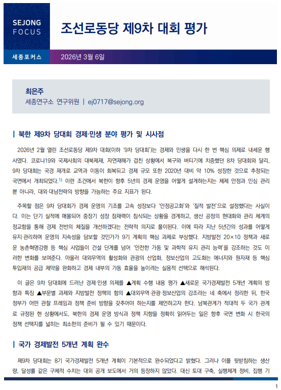 이 글은 9차 당대회에 드러난 경제·민생 의제를 ▲계획 수행 내용 평가 ▲새로운 국가경제발전 5개년 계획의 방향과 특징 ▲부문별 과제와 지방발전 정책의 함의 ▲대외무역·관광·정보산업의 강조라는 네 축에서 정리한 뒤, 한국 정부가 어떤 관찰 프레임과 정책 준비 방향을 갖추어야 하는지를 제언하고자 한다. 남북관계가 적대적 두 국가 관계로 규정된 현 상황에서도, 북한의 경제 운영 방식과 정책 지향을 정확히 읽어두는 일은 향후 국면 변화 시 한국의 정책 선택지를 넓히는 최소한의 준비가 될 수 있기 때문이다. -