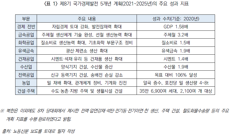 북한은 제8기 기간(2021~2025년)의 경제 상황에 대하여 “사회주의 건설이 전면적 발전 단계에 확고히 들어선 위대한 전환의 년대”라고 평가하였다. 이와 같은 총괄적인 평가는 9차 당대회에서 밝힌 내용과 크게 다르지 않지만, 이번 최고인민회의에서는 기간공업과 자립경제 토대 강화의 성과를 구체적인 수치와 부문별 실적으로 제시함으로써 그 내용을 보다 세부적으로 설명하였다. 동시에 농업과 건설, 수산업, 지방 발전의 실적을 함께 제시함으로써 경제적 성과의 범위를 주민들이 실질적으로 체감할 수 있는 생활 영역으로 확장하고 있다.