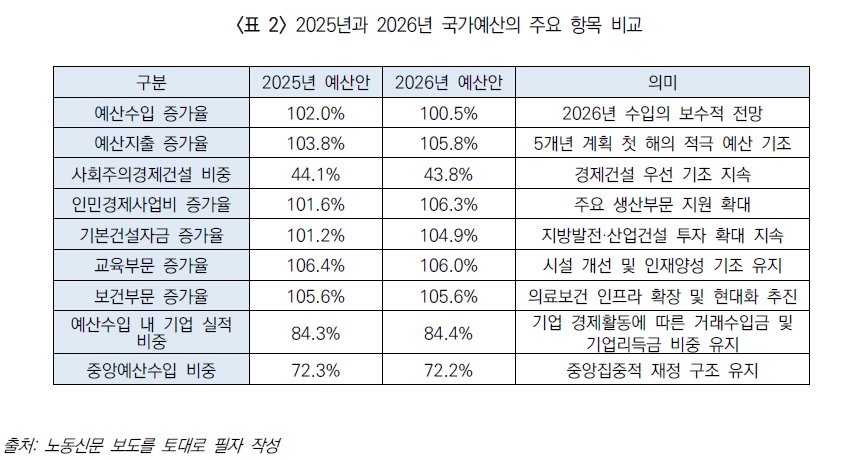 이러한 정책 방향이 실제 자원의 배분 과정에서 어떻게 반영되었는지는 2026년 예산 편성을 통해 확인할 수 있다. 2025년과 2026년 예산의 주요 항목을 비교하면 <표 2>와 같다.