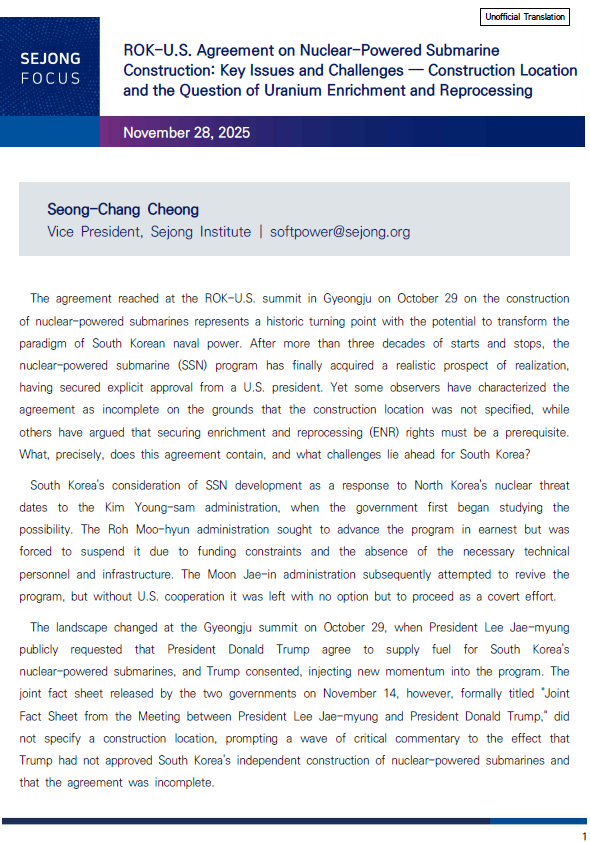 The agreement reached at the ROK-U.S. summit in Gyeongju on October 29 on the construction of nuclear-powered submarines represents a historic turning point with the potential to transform the paradigm of South Korean naval power. After more than three decades of starts and stops, the nuclear-powered submarine (SSN) program has finally acquired a realistic prospect of realization, having secured explicit approval from a U.S. president. Yet some observers have characterized the agreement as incomplete on the grounds that the construction location was not specified, while others have argued that securing enrichment and reprocessing (ENR) rights must be a prerequisite. What, precisely, does this agreement contain, and what challenges lie ahead for South Korea?