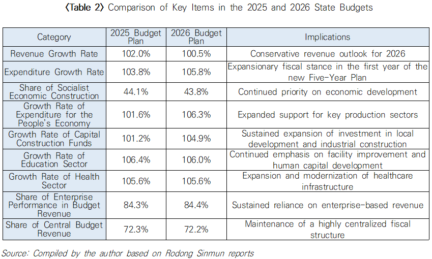 The most notable feature in <Table 2> is the widening gap between the revenue growth rate (0.5%) and the expenditure growth rate (5.8%). This unusually higher increase in expenditure relative to revenue cannot be explained solely by weakening fiscal conditions. In 2025, state budget revenue was executed at 105.1% of the plan, marking the highest execution rate since Kim Jong Un came to power. Moreover, at the time of the 2025 budget announcement, North Korea projected that transaction revenues and state enterprise profits would account for 84.3% of total budget revenue, indicating that fiscal income remains heavily dependent on the production and transaction performance of the state sector. Taken together, the over-fulfillment of 2025 budget revenue suggests that a degree of economic recovery, particularly in the state sector, translated into increased fiscal income.