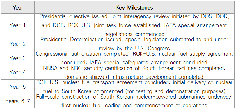 A well-defined roadmap enables a clear-eyed assessment of phased requirements and risk factors, as opposed to reliance on vague expectations or unfounded concern. It will also support strategic communication with the National Assembly, the press, and civil society. Drawing on the AUKUS (Australia-United Kingdom-United States) precedent,3) this roadmap operates on a timeframe of five to seven years and is organized around three central pillars: U.S. domestic approval procedures, coordination with the international nonproliferation regime, and the operation of ROK-U.S. working-level consultative bodies. -