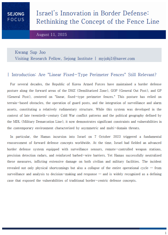[Sejong Focus] Israel’s Innovation in Border Defense Rethinking the Concept of the Fence Line