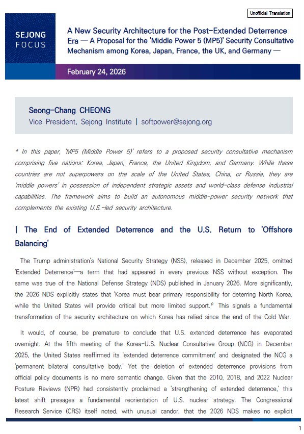 [Sejong Focus] A New Security Architecture for the Post-Extended Deterrence Era — A Proposal for the 'Middle Power 5 (MP5)' Security Consultative Mechanism among Korea, Japan, France, UK, & Germany
