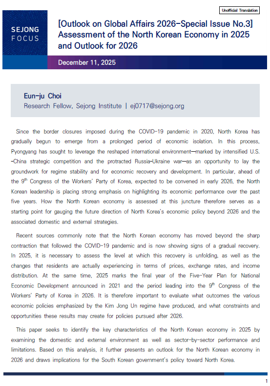 [Outlook on Global Affairs 2026-Special Issue No.3] Assessment of the North Korean Economy in 2025 and Outlook for 2026