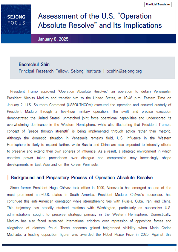 [Sejong Focus] Assessment of the U.S. “Operation Absolute Resolve” and Its Implications