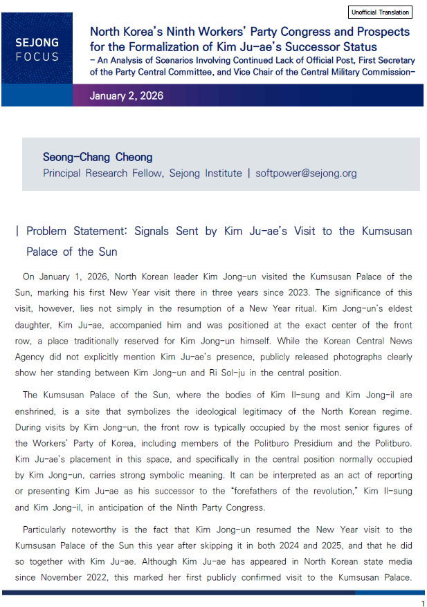 [Sejong Focus] North Korea’s Ninth Workers’ Party Congress and Prospects for the Formalization of Kim Ju-ae’s Successor Status