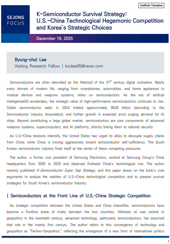 [Sejong Focus] K-Semiconductor Survival Strategy: U.S.-China Technological Hegemonic Competition and Korea’s Strategic Choices
