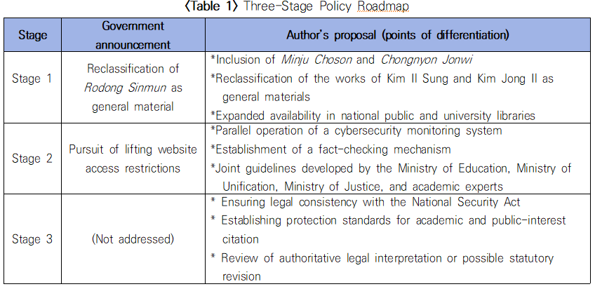 Stage 3: This stage focuses on ensuring consistency between the National Security Act and the policy of openness. The government should establish clear guidelines on the use of North Korean materials, protecting academic and public-interest citation while setting standards that clearly distinguish genuine acts of aiding the enemy. Given that existing case law requires not mere possession or reading but an act of praise, incitement, or propaganda, the boundary between openness and punishment can be defined on a sound legal basis.