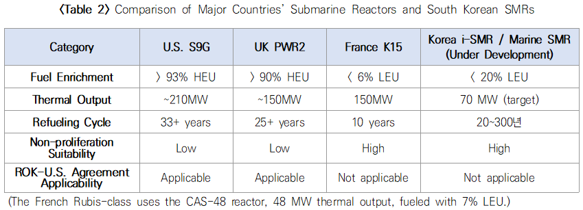 Professor Lee Jeong-ik of the Department of Nuclear and Quantum Engineering at KAIST assessed that “the small reactor SMART developed by KAERI in 2012 is not based on American technology and is therefore not subject to the ROK-U.S. Nuclear Cooperation Agreement; while a submarine reactor is more technically challenging than a commercial reactor, it is a feasible endeavor.8) This means that it is not the SMART technology itself, but rather the reactor design capabilities accumulated through SMART’s development that can be leveraged for submarine reactor development.