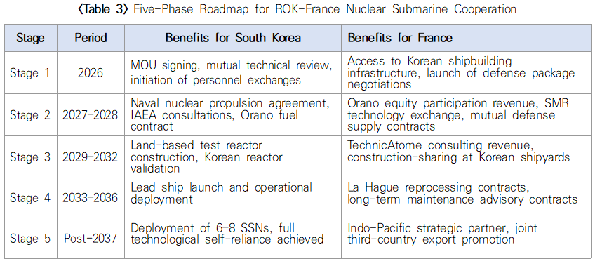 A Memorandum of Understanding (MOU) on nuclear submarine cooperation will be signed at the ROK-France summit in April 2026. This phase will focus on mutual review of existing Korean technologies (SMART, Munmu Daewang Research Center SMR) and French technology (K15), and identifying complementarities. Simultaneously, the French side will conduct due diligence on Korean shipbuilding infrastructure and negotiate the basic framework for a defense package cooperation. Exchanges of personnel—Korean technical staff dispatched to France and French experts advising in Korea—will commence.