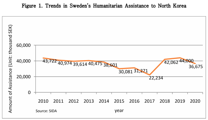 In the mid-1990s, as North Korea faced severe food shortages caused by natural disasters, Pyongyang requested assistance from various international organizations, including the UN Department of Humanitarian Affairs (UNDHA), the World Health Organization (WHO), and the United Nations Children’s Fund (UNICEF). It also permitted the presence of international relief organizations in Pyongyang. To deliver humanitarian aid, international agencies mobilized a wide range of NGOs, and roughly 130 relief organizations worldwide participated in assistance efforts, with the World Food Programme (WFP) playing the largest role. Sweden began providing humanitarian assistance to North Korea in 1995 and maintained uninterrupted support of roughly 4 to 5 million USD annually until 2020. At one point, in 2011, Sweden ranked first among donor countries in terms of per-country humanitarian contributions to North Korea.