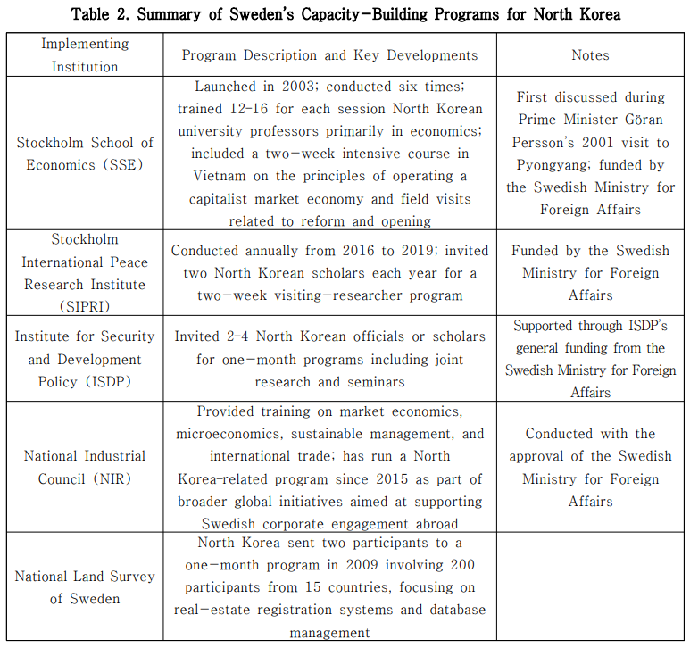 Sweden’s capacity-building programs for North Korea were carried out primarily through non-governmental academic and research institutions such as the Stockholm School of Economics, the Stockholm International Peace Research Institute (SIPRI), and the Institute for Security and Development Policy (ISDP).