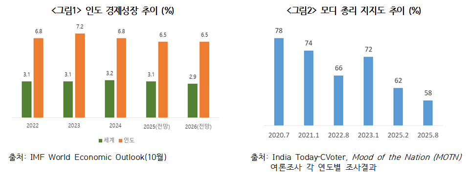 2025년 인도는 세계 주요국 가운데 가장 높은 6.5% 성장률을 기록하며 경제대국으로서의 위상을 한층 공고히 하였다. 그러나 2024년 총선 이후 형성된 연정 구조, 청년 고용과 농촌 지역의 경제·사회적 취약성 심화,