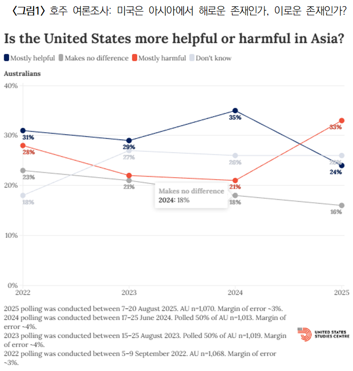 1) United States Studies Centre, “The Albanese-Trump Summit: Where Do Australians Stand on Their Most Important Ally?” October 16, 2025, https://www.ussc.edu.au/the-albanese-trump-summit-where-do-australians-stand-on-their-most-important-ally?utm_medium=email&utm_campaign=PUBLICATION%20ALERT%20%20Polling%202-pager&utm_content=PUBLICATION%20ALERT%20%20Polling%202-pager+CID_f80142bd5dd7f8c366a3484b60549d0a&utm_source=USSC%20Campaign%20Monitor&utm_term=The%20Albanese-Trump%20summit%20Where%20do%20Australians%20stand%20on%20their%20most%20important%20ally (최종접속일: 2025년 11월 30일)