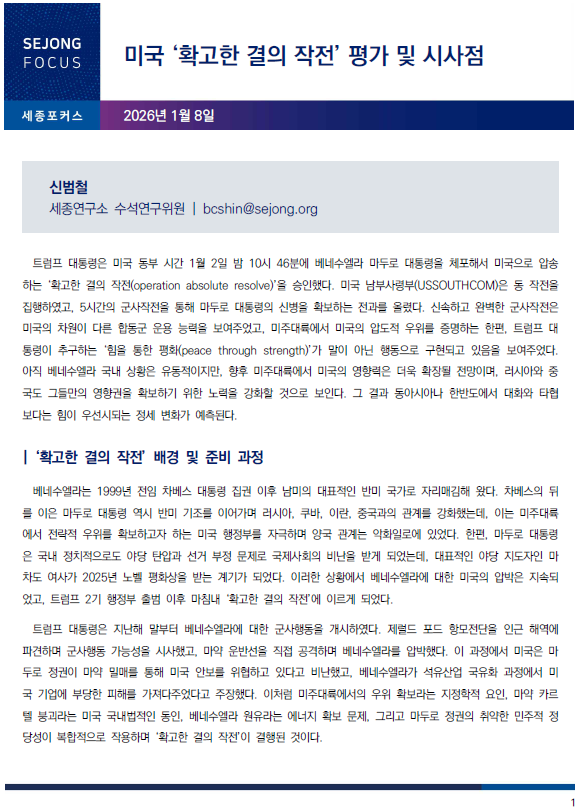 - 트럼프 대통령은 미국 동부 시간 1월 2일 밤 10시 46분에 베네수엘라 마두로 대통령을 체포해서 미국으로 압송하는 ‘확고한 결의 작전(operation absolute resolve)’을 승인했다. 미국 남부사령부(USSOUTHCOM)은 동 작전을 집행하였고, 5시간의 군사작전을 통해 마두로 대통령의 신병을 확보하는 전과를 올렸다. 신속하고 완벽한 군사작전은 미국의 차원이 다른 합동군 운용 능력을 보여주었고, 미주대륙에서 미국의 압도적 우위를 증명하는 한편, 트럼프 대통령이 추구하는 ‘힘을 통한 평화(peace through strength)’가 말이 아닌 행동으로 구현되고 있음을 보여주었다. 아직 베네수엘라 국내 상황은 유동적이지만, 향후 미주대륙에서 미국의 영향력은 더욱 확장될 전망이며, 러시아와 중국도 그들만의 영향권을 확보하기 위한 노력을 강화할 것으로 보인다. 그 결과 동아시아나 한반도에서 대화와 타협보다는 힘이 우선시되는 정세 변화가 예측된다.