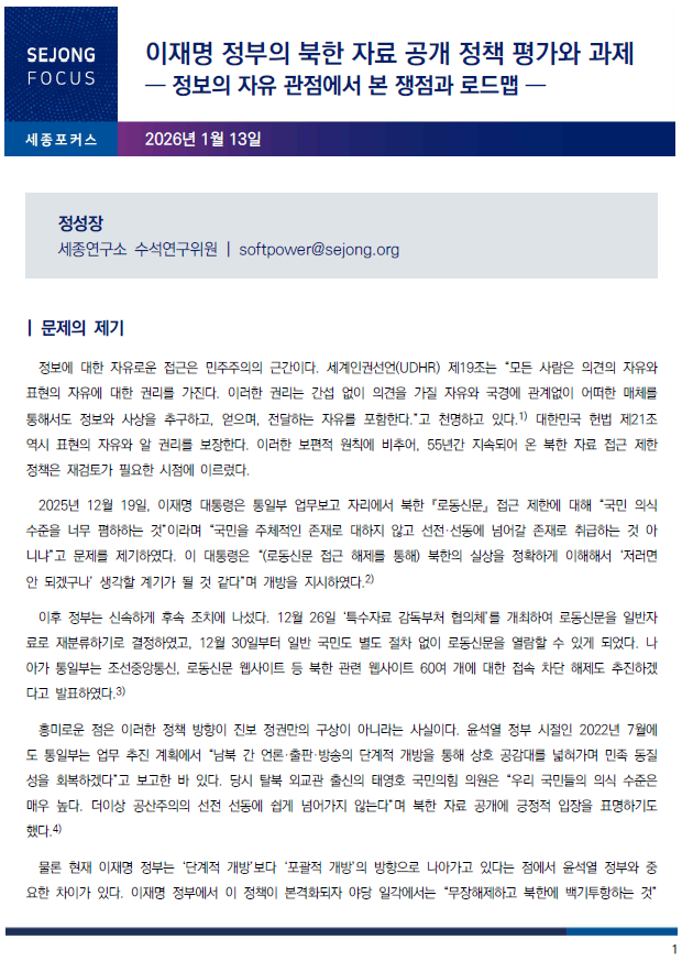 본고는 이재명 정부의 북한 자료 공개 정책을 ‘정보의 자유’라는 보편적 관점에서 평가하고, 이 정책을 둘러싼 핵심 쟁점을 분석하며, 정부 발표를 넘어서는 정책 로드맵을 제안하고자 한다. -