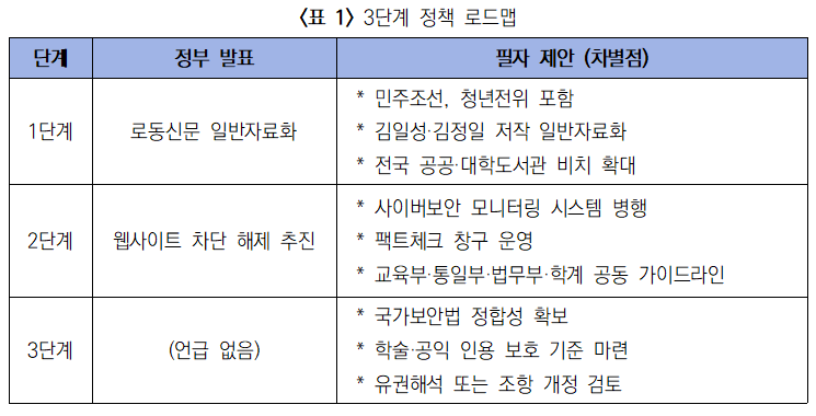2단계: 국회 입법을 통해 정보통신망법 등 관련 법을 개정한 뒤, 조선중앙통신과 로동신문 웹사이트 등 북한 공식 매체 사이트의 접속 차단을 해제한다. 이 단계에서는 기술적 모니터링 시스템을 병행하여 사이버 보안 위협을 점검하고, 북한이 유포하는 허위정보에 대한 팩트체크 창구도 운영한다. 교육부·통일부·법무부·학계 공동 가이드라인 마련도 검토할 필요가 있다.