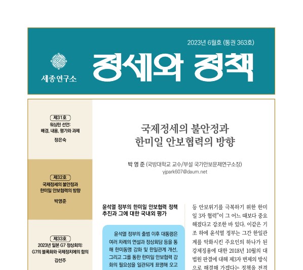 윤석열 정부의 출범 이후 추진되고 있는 한미동맹 강화, 한일관계 정상화, 그리고 이를 바탕으로 한 한미일 안보협력 강화는 한국이 처한 국제안보질서의 변화나 한국의 국가이익을 고려할 때 불가피한 선택이다. 러시아의 우크라이나에 대한 군사적 침공으로 말미암아 유엔 안보리나 NPT와 같은 국제안보질서가 동요하고 있다. 미중 간의 전략적 경쟁 격화 속에서 대만 해협의 군사적 긴장이 고조되고 있다. 북한은 핵 및 미사일 능력을 고도화시키면서, 공세적인 핵전략을 감추고 있지 않다. 이같은 한반도와 글로벌 안보질서의 불확실성에 대응하기 위한 최선의 방책은 한미동맹 및 한미일 안보협력의 기반을 공고히 하는 것이다. 이러한 정책방향이 ‘글로벌 중추국가’를 표방한 한국의 국제적 위상을 높이는 외교와 안보정책의 출발점이 될 수 있다.