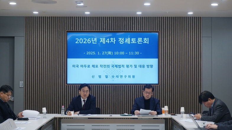 1월 27일(화) 개최된 세종연구소 2026년 제4차 정세토론회에서 신범철 수석연구위원이 "미국 마두로 체포 작전의 국제법적 평가 및 대응 방향"을 주제로 발표하였다.