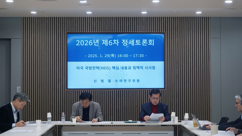 1월 29일(목) 개최된 세종연구소 2026년 제6차 정세토론회에서 신범철 수석연구위원이 "미국 국방전략(NDS) 핵심 내용과 정책적 시사점"을 주제로 발표하였다.