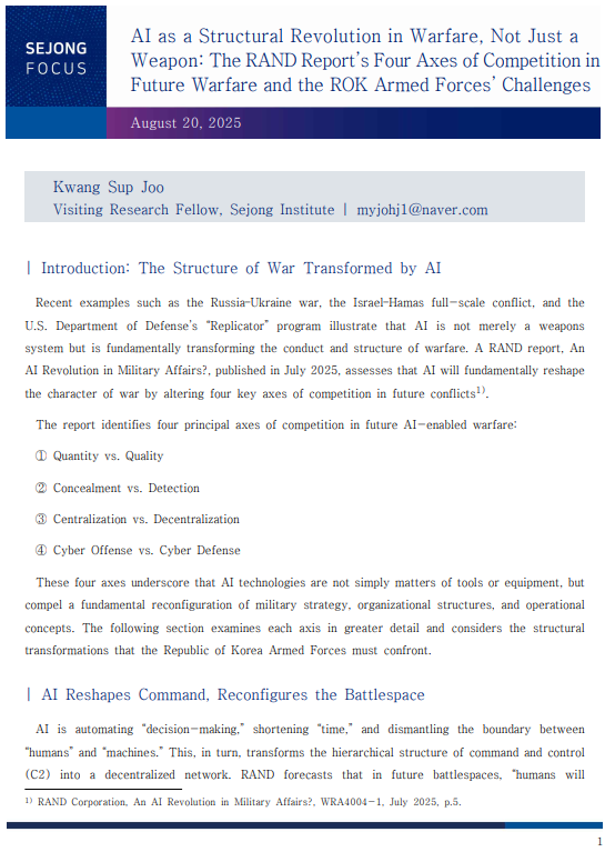 [Sejong Focus] AI as a Structural Revolution in Warfare, Not Just a Weapon: The RAND Report’s Four Axes of Competition in Future Warfare and the ROK Armed Forces’ Challenges
