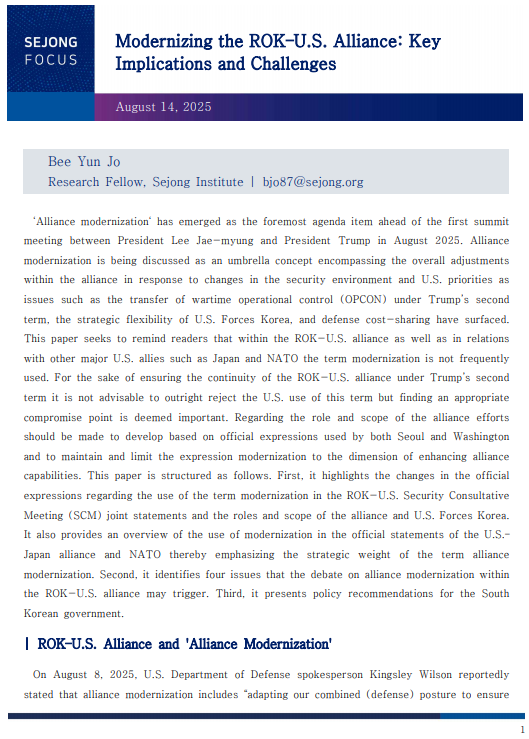 [Sejong Focus] Modernizing the ROK–U.S. Alliance: Key Implications and Challenges