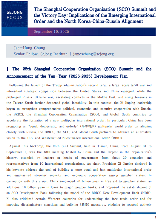 [Sejong Focus] The Shanghai Cooperation Organization (SCO) Summit and the Victory Day : Implications of the Emerging International Order and the North Korea–China–Russia Alignment