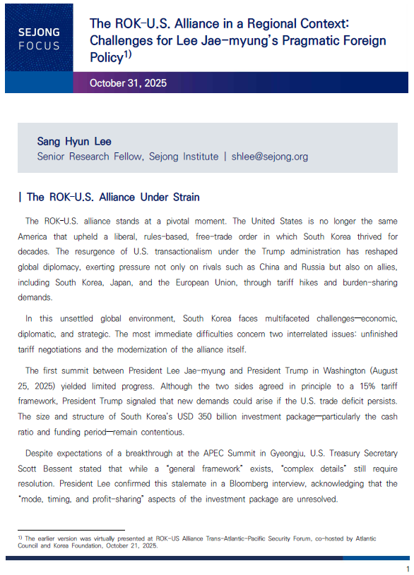 [Sejong Focus] The ROK–U.S. Alliance in a Regional Context: Challenges for Lee Jae-myung’s Pragmatic Foreign Policy