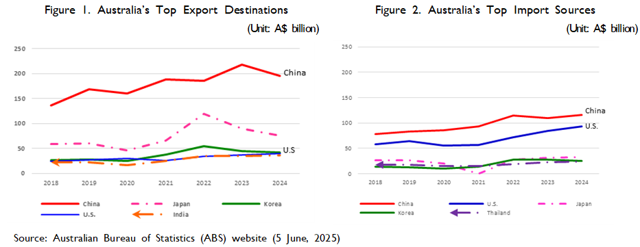 Australia’s initial expectation that it might pass through Trump-era tariff turbulence relatively quietly reflected a distinctive bilateral trade structure. In 2024, Australia exported US$23.8 billion to the United States and imported US$50.6 billion, producing a bilateral trade deficit of US$26.9 billion from Australia’s perspective.4)