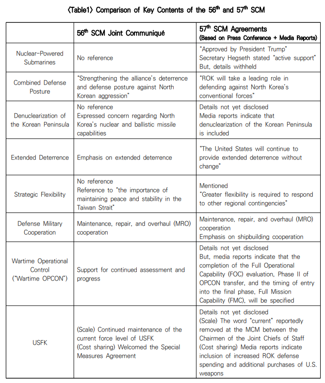 The delay in the SCM Joint Communiqué is understood to stem from the question of how to incorporate the details related to the agreement on nuclear-powered submarine construction reached at the summit. Because this issue carries significant weight and the Joint Fact Sheet has been released later than initially announced, the publication of the SCM Joint Communiqué is also expected to face a considerable delay. This raises concerns that attention may shift away from critical alliance issues such as combined defense posture, denuclearization of the Korean Peninsula, the strategic flexibility of U.S. forces in Korea (USFK), the transfer of wartime operational control, and the scale of U.S. forces stationed in Korea. Based on the information disclosed to date, this paper evaluates the SCM outcome and identifies policy implications. It first reviews the significance and evolution of the SCM, then examines the main issues of the 57th SCM in comparison with the 56th SCM, and concludes with policy implications. -