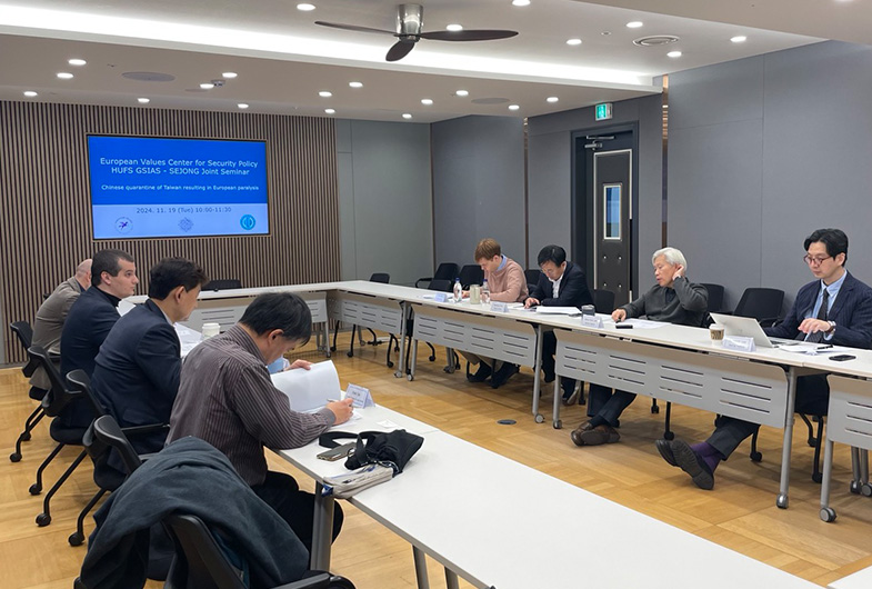 On November 19 afternoon, the Sejong Institute held a seminar with the European Values Center for Security Policy and the Graduate School of International and Area Studies at Hankuk University of Foreign Studies on the topic of "China's Taiwan Strategy Scenarios and European Policy Decisions." The discussion covered topics such as the increasing European interest in the Taiwan crisis, lessons from Taiwan crisis simulations, and policy divisions among European countries.